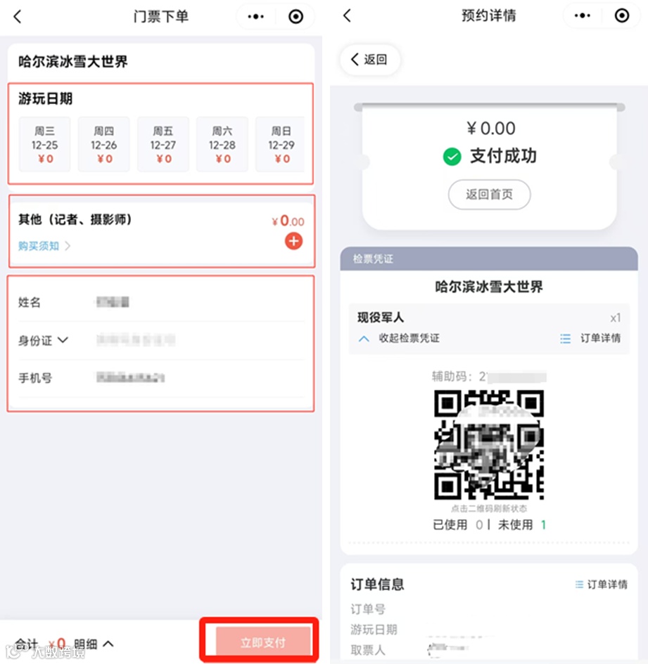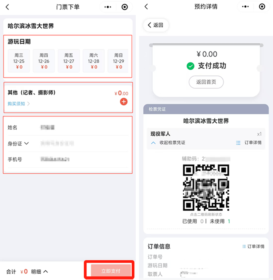 选择“游玩日期”,依次填写数量、姓名、身份证号、手机号后,再点击“立即预约”;预约成功后,显示“支付成功”字样,将收到预约二维码。