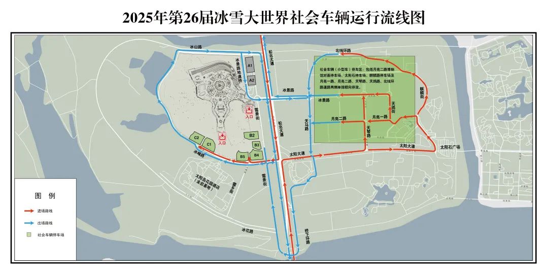 特别提示:车辆停放后可就近乘坐免费接驳车由太阳岛停车场去往冰雪大世界园区,返回时由A1停车场乘坐免费接驳车返回停车区域。