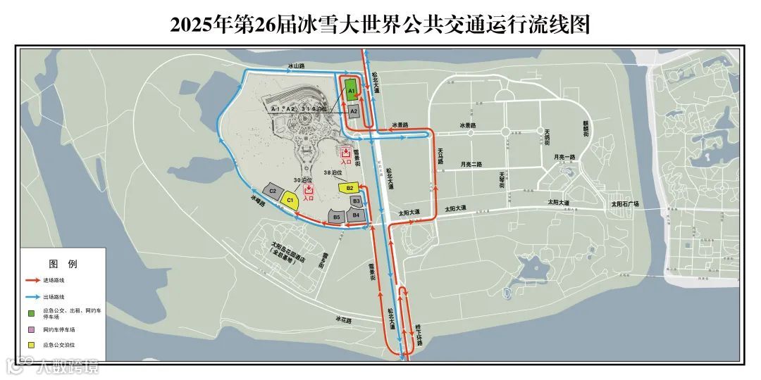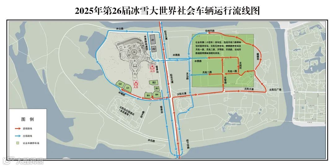 公路大桥——松北大道——太阳大道——麒麟街——太阳石停车区域、月亮一路、月亮二路沿线停车区域,停车后就近乘坐接驳车到冰雪大世界园区。