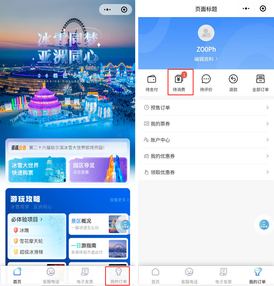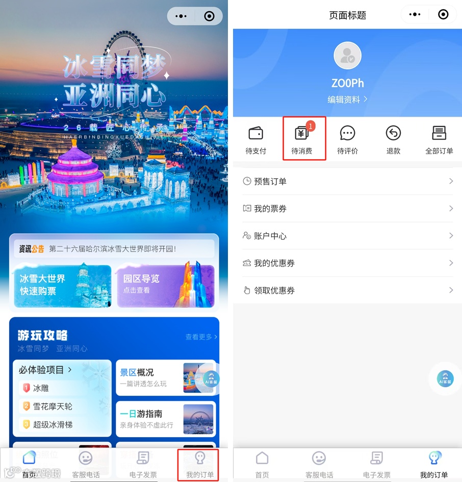 选择“我的订单”;页面跳转后,点击“待消费”;