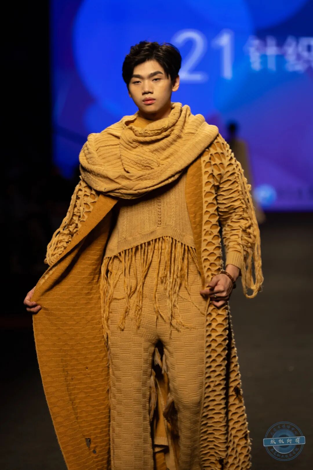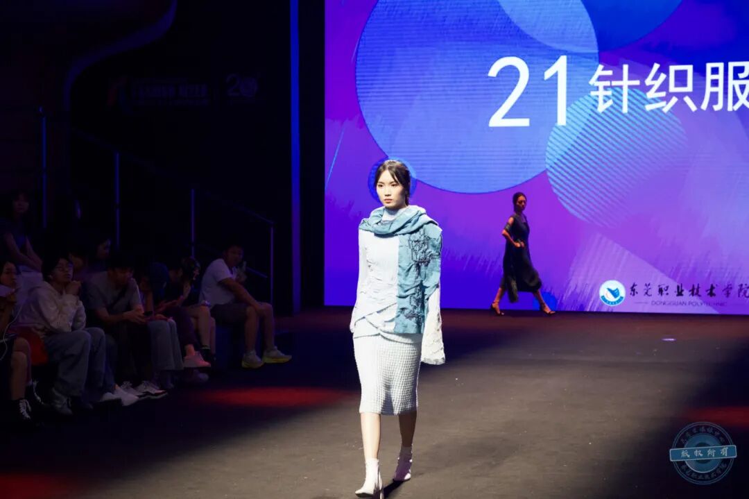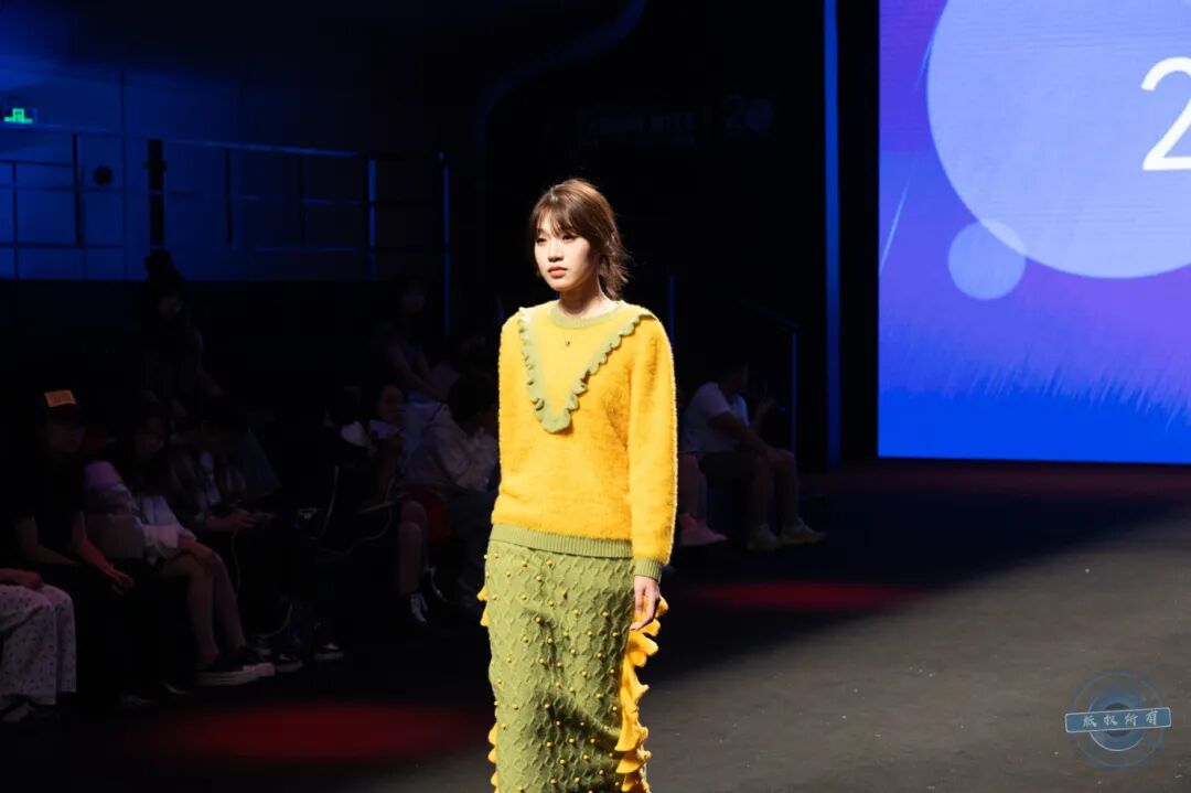 在紧张的打分环节,我校大朗毛织服装产业学院学生团队创作的毛织服装系列作品依次登场。