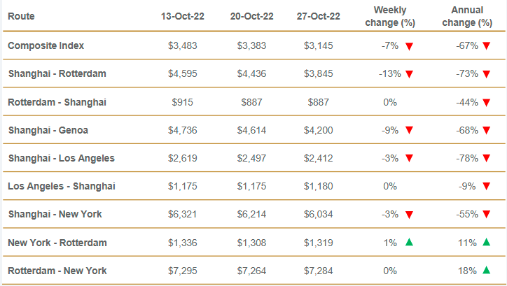 德路里世界集装箱运价指数WCI最新一期周跌7%,已连续35周下滑。较去年同期下跌67%。在经历连续两位数周跌幅之后,自10月初以来跌幅有所收窄。不过,本期7%下滑是10月最大的一次跌幅。各大主要航线继续全面下跌,上海-鹿特丹的北欧航线运价大幅下滑13%,而上海-洛杉矶运价进一步下滑较2021年9月峰值已下降了81%以上。