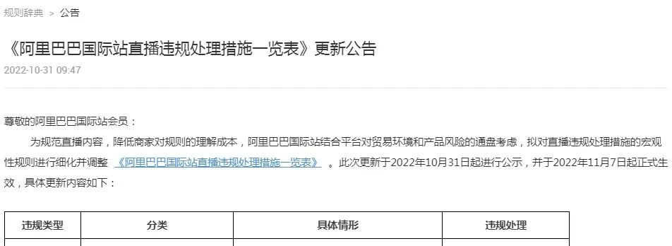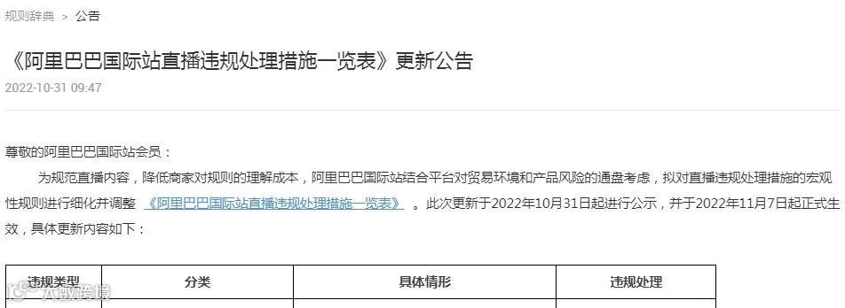 10月31日消息,阿里国际站今日发布《阿里巴巴国际站直播违规处理措施一览表》更新公告(以下简称公告)。