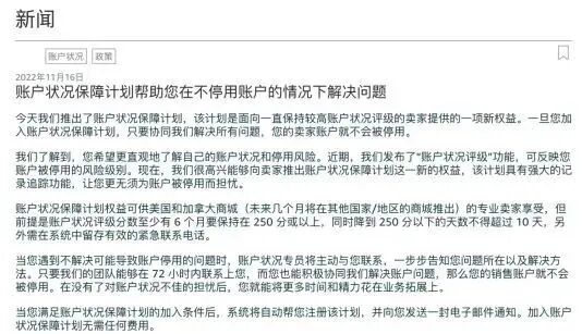 2022年11月17日,亚马逊在美国站宣布将推出账户状况保障计划,只要卖家在72小时之内配合解决问题,账号就可能不会被封!