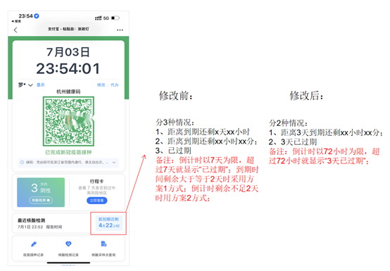 A:根据防疫需求,将核酸有效期“7天”改成“72小时”,涉及健康码页面上1个模块的内容修改,具体如下: