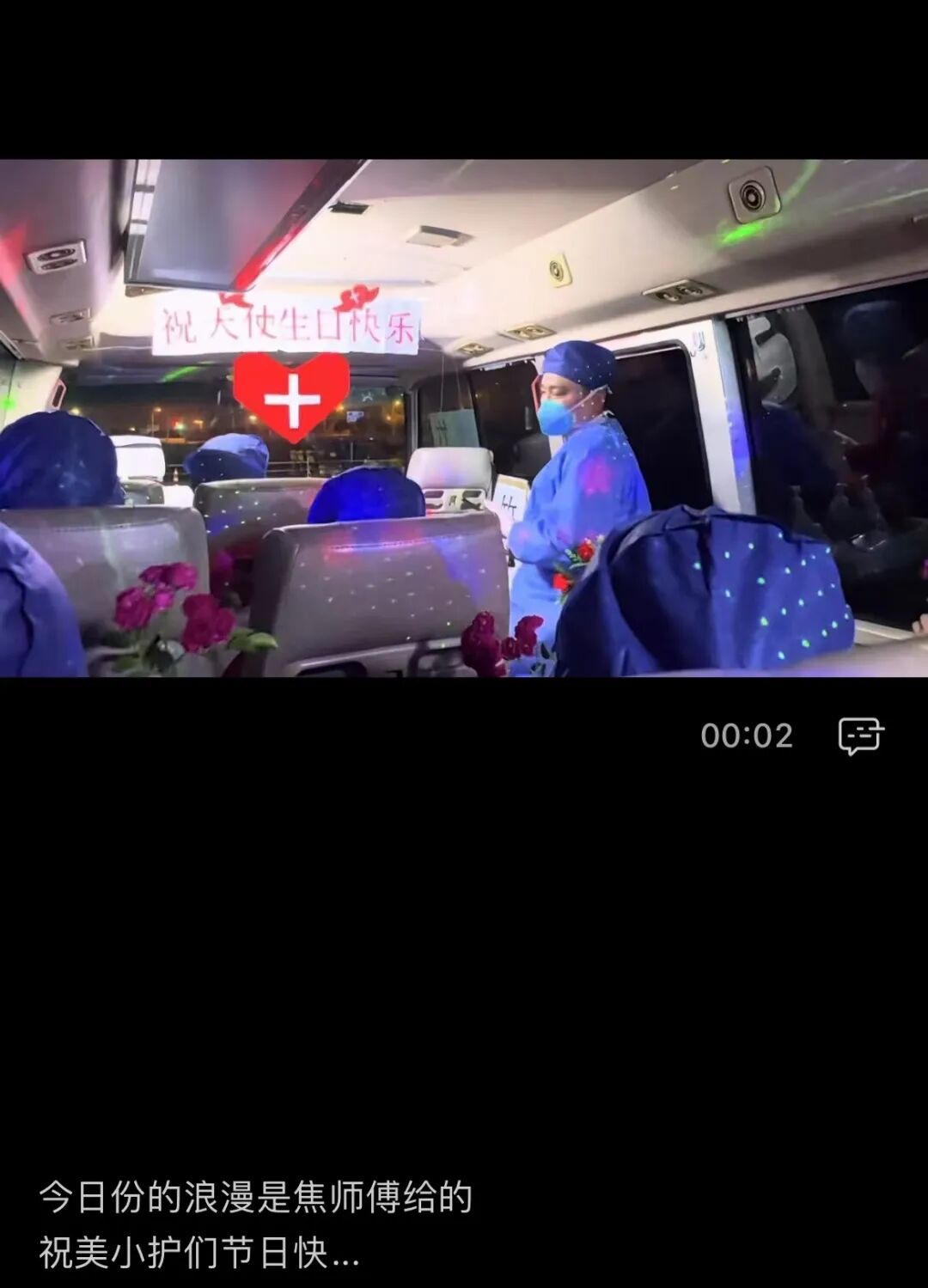 “5·12”护士节前一天,焦士杰一大早就起床开始布置他的车,为了这一天他已经提前准备了很久。“说来也巧,那天送医护们去方舱,出了高速收费站正好是0点整,我停下车让大家稍等几分钟,邀请刚好当天生日的一个护士到车前头揭开提前盖好的红布,‘祝天使们生日快乐’几个字出来的时候,全车的人都在欢呼。看她们开心,我觉得一切都值了”。