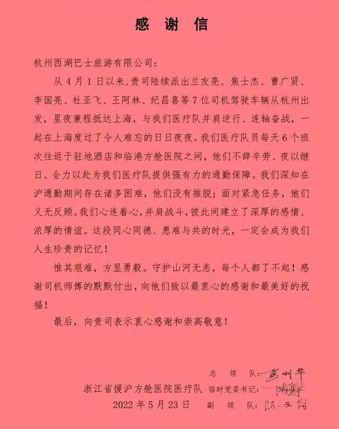 此次上海抗疫过程中,除了和焦士杰一样告别亲人、远离家乡,在一线并肩作战的司机们,还有那些连续坚守的后勤保障人员,他们虽在大后方,然而心却是和一线抗疫人员紧紧连接在一起的。抗疫保卫战成功归来,我们的城市不再需要“超级英雄”,然而,杭州西湖旅游巴士有限公司的7位巴士司机,我们会永远记得你们在自己平凡岗位上的坚守和奉献!你们就是上海抗疫中最美的人!