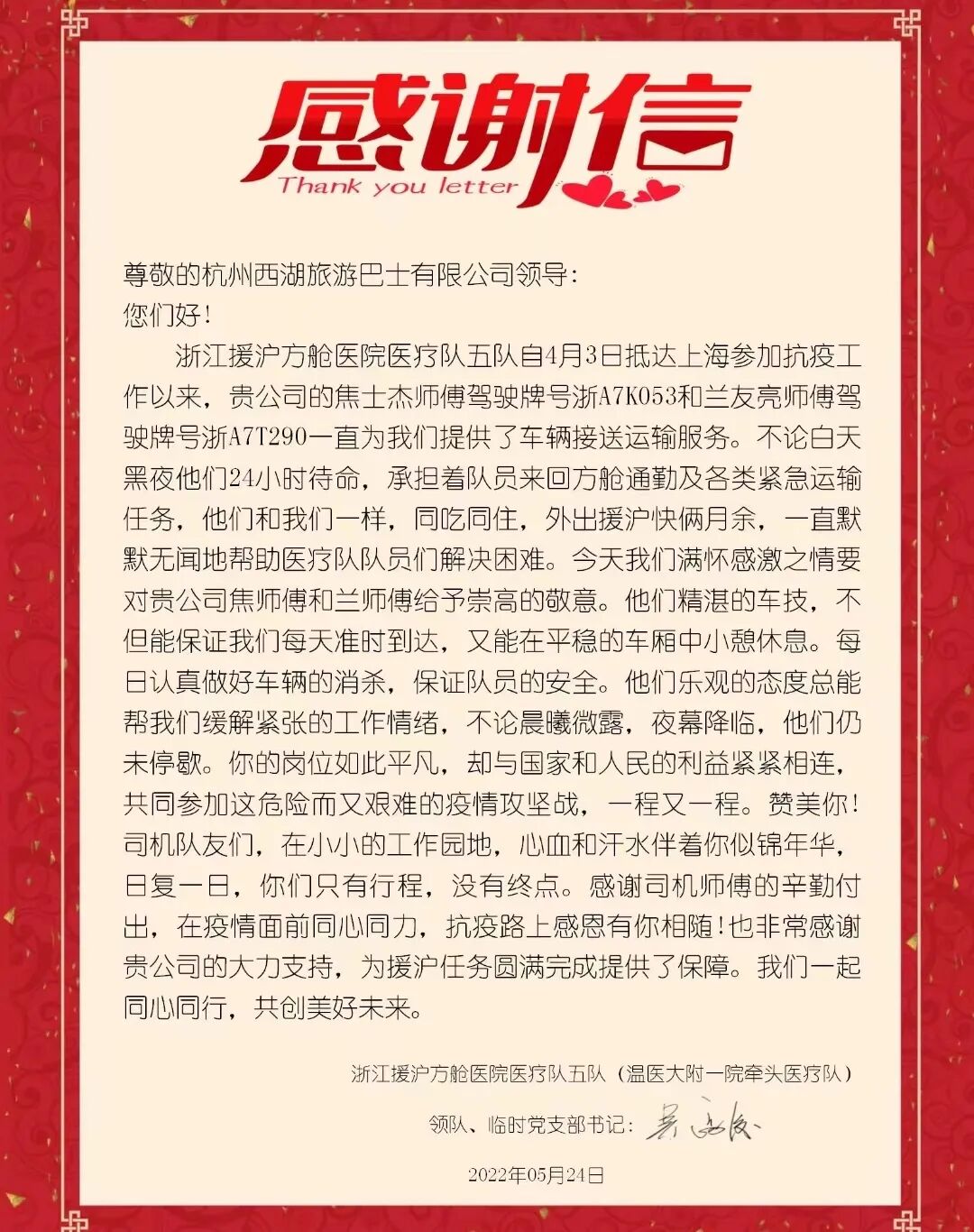 为了缓解上海疫情进一步扩散的紧张局势,4月4日,浙江省援沪方舱医院医疗队集结完毕,200多名医疗队员整装待发,准备立即前往上海抗疫一线。在此之前,杭州西湖旅游巴士有限公司一直在为杭州抗疫工作做贡献,这次也不例外,接到消息后主动请缨,当即在公司内部发布了招募志愿者的通知。
