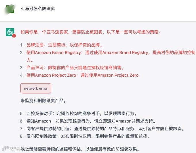 有卖家向ChatGPT提问“亚马逊怎么防跟卖?”得到的回复逻辑清晰,有理有据。