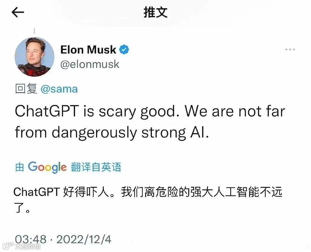 特斯拉CEO马斯克发推表示:“ChatGPT好用到吓人,我们离强大到危险的人工智能不远了。”