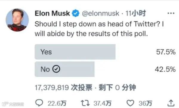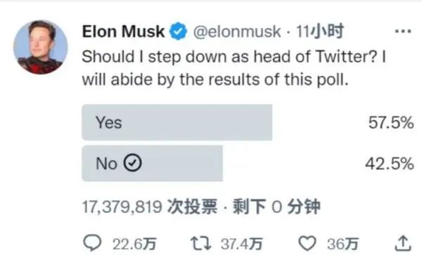 2、当地时间12月18日,特斯拉、推特ceo埃隆·马斯克发起了一项“是否辞任推特ceo”的投票,截至投票结束,累计收获了1738万次投票,其中赞成票的比例达57.5%。对此,马斯克表示,他将遵守投票结果。意味着,马斯克即将卸任推特ceo。
