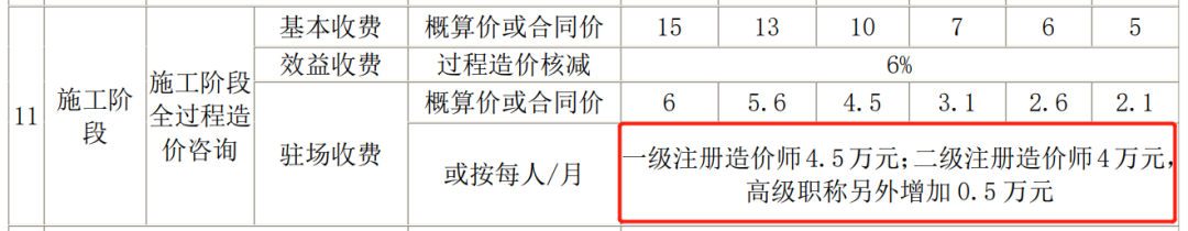 驻场收费:一级注册造价师4.5万元;二级注册造价师4万元,高级职称另外增加0.5万元。