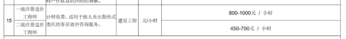 计日收费:一级注册造价工程师:800-1000元 /小时;二级注册造价工程师:450-700元/小时。