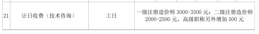 计日收费:一级注册造价师3000-3500元;二级注册造价师2000-2500元,高级职称另外增加500元。