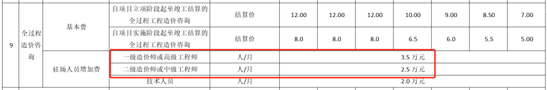 福建:一级造价师或高级工程师3.5万元/人月;二级造价师或中级工程师2.5万元/人月。