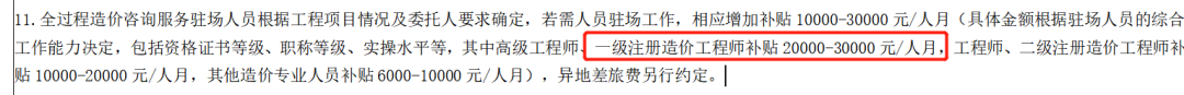 驻场收费:一级注册造价工程师补贴20000-30000元/人月;工程师、二级注册造价工程师补贴10000-20000元/人月;其他造价专业人员补贴6000-10000元/人月)。