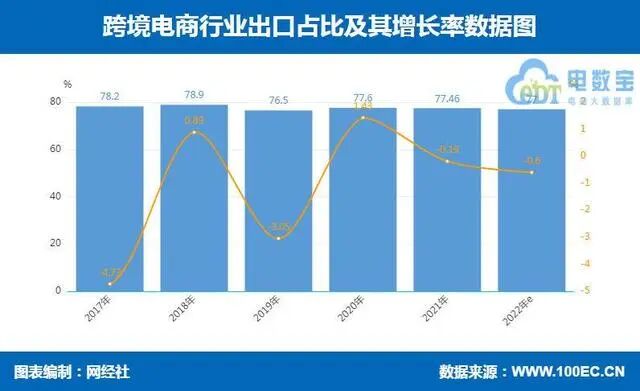 在进出口结构方面,2022上半年中国跨境电商出口占比达到77.47%,进口比例22.53%。跨境电商进出口结构总体相对稳定,但随着进口市场的不断扩大,市场占比也将不断提升。