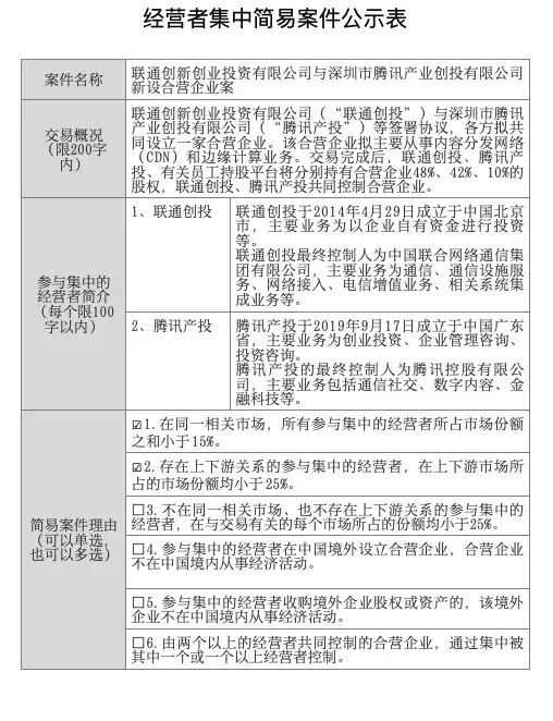 1、11月2日,国家市场监管总局官网消息,《2022年10月17日-10月23日无条件批准经营者集中案件列表》显示,联通创新创业投资有限公司与深圳市腾讯产业创投有限公司新设合营企业案获无条件批准,审结时间为10月18日。