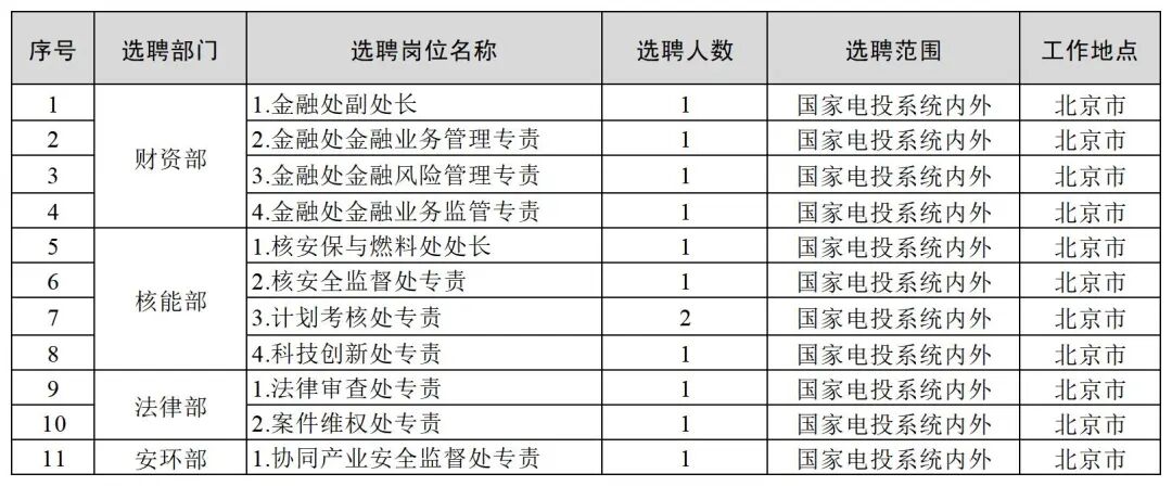 根据工作需要,现面向系统内外公开选聘国家电力投资集团有限公司总部管理人员,具体事项公告如下: