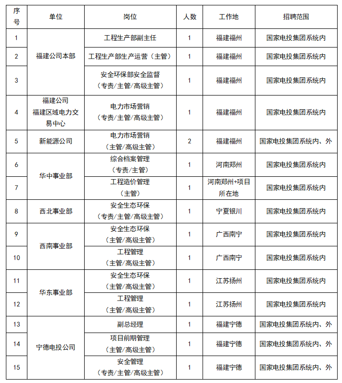 国家电投集团福建新能源有限公司(简称“新能源公司”)是福建公司在闽区域设立的全资子公司(三级单位),主要负责福建地区风电、光伏、综合智慧能源等项目开发、工程建设、生产运营等工作,并根据授权代表福建公司负责省外受托新能源项目的工程建设、生产运营、电力市场营销等。