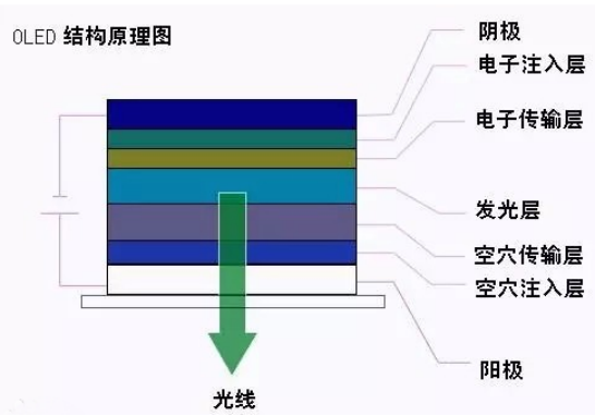 OLED(Organic Light-Emitting Diode)又称有机电激光显示、有机发光半导体,它利用有机半导体材料和发光材料,在电场驱动下,发生载流子注入和复合来发光。外加电场后,阳极产生的空穴和阴极产生的电子会发生移动,分别向空穴传输层和电子传输层注入,随后迁移到发光层。当二者在发光层相遇后,释放能量形成激子。激子本身作为发光材料分子的激发态,当跃迁回基态时,发生辐射弛豫,因此向外发出可见光。将三个有机发光半导体放在RGB滤色器背面,通过控制电流的大小,就可以单独控制每个子像素的亮度了。相比于LCD,OLED不需要背光层和液晶层,它就像一个个小灯泡组合而成的屏幕。所以息屏时,所有的小灯泡都是关闭的状态,屏幕呈现的就是纯黑色。