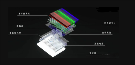 LCD(Liquid Crystal Display)为液晶显示器,每个像素由背光、彩色滤光片和偏光器三部分组成。从背光源发出的光先穿过垂直偏光片,未通电时,液晶分子不会改变光的偏振方向,所以光线无法通过水平偏光片,所以屏幕看起来是黑色的。想要有光透过,就要看液晶层大展身手了。每个液晶前后都有透明的电极,通电后,电场使得液晶分子的排列方向偏转,当光穿过液晶时,它会与液晶分子排列一致。这样一来,光会被液晶层偏置,于是可以通过调整流过每组电极的电流,来控制到达每个滤光片的光强,进而控制显示器上显示的颜色。
