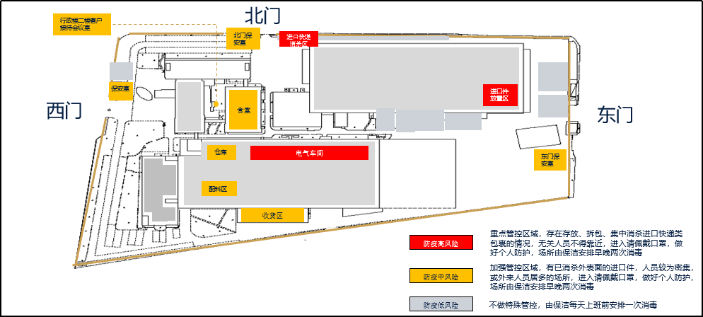 处理好重点环节防疫和常态化防疫的关系,将人员、空间、物流、进口部件等的防疫管理流程化,厂区划分高、中、低三级风险区域,分区管控,压实责任。