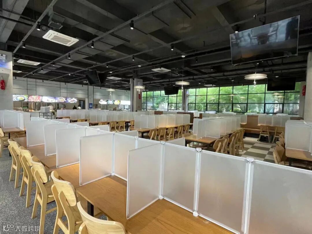 配备免洗消毒洗手液,落实定时的消毒消杀和开窗通风要求。食堂实施分散分时就餐,排队等候区划定一米线,餐桌上安装固定隔板。