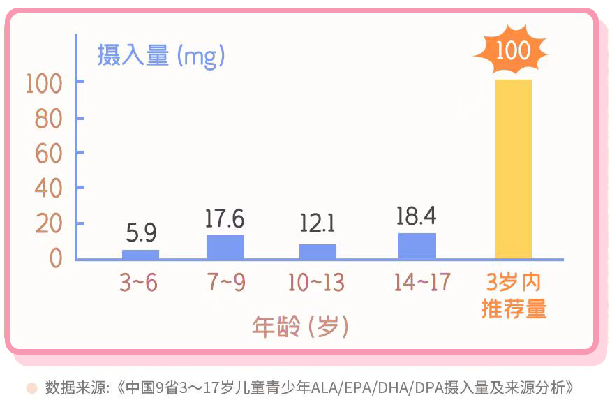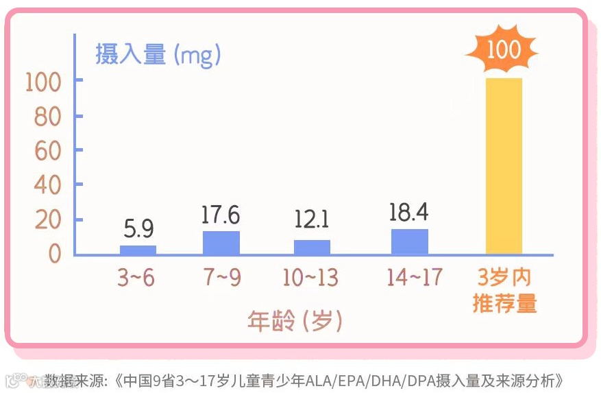 之前就有调查发现,3 岁+儿童的 DHA 摄入量远低于推荐量。3-6 岁更是明显,每天只有 5.9mg,连推荐摄入量的 1/10 都达不到。