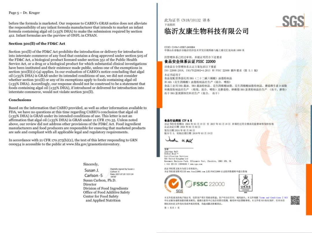 好不是口头说说而已,伊可新这款藻油 DHA 中的 DHA 原料还通过了严苛的美国 FDA GRAS 认证,添加的 ARA 原料也获得了高标准的欧盟 FSSC 认证。