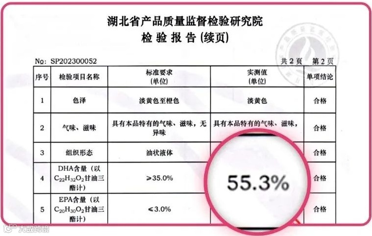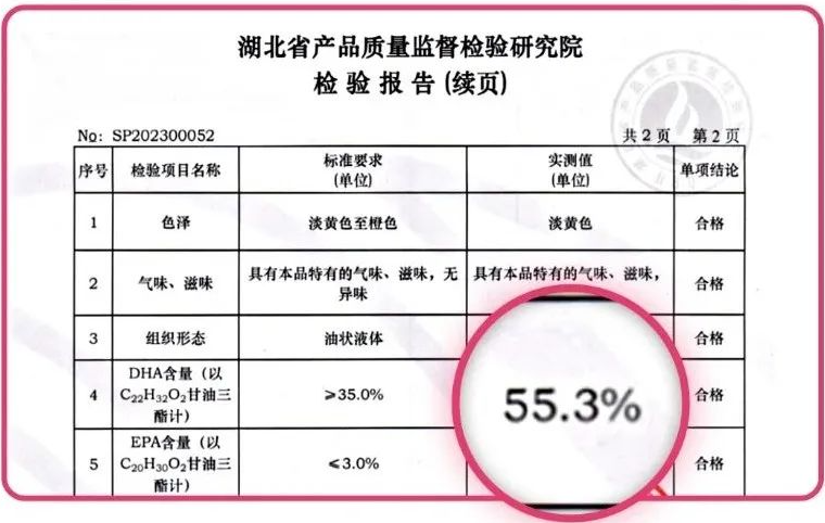 DHA 纯度达到了 55.3%,不仅远超行业标准(35%),也比市面上很多 DHA 产品都高,娃营养吸收消化负担也更小~