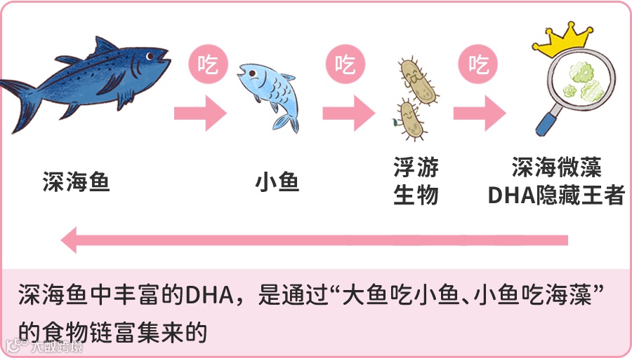 先说说原料。大家都知道深海鱼的 DHA 含量很丰富,其实深海鱼中的 DHA 是通过“大鱼吃小鱼,小鱼吃海藻”的食物链富集来的。