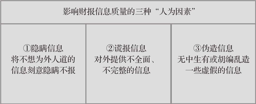 有三种“人为因素”会对财务报告的数据质量产生重大影响,即报表提供者刻意隐瞒某些信息、谎报某些信息或者提供经过伪造的信息。在这三种情况中,伪造的性质最为恶劣。下面,我们对这三种情况逐一进行解读。