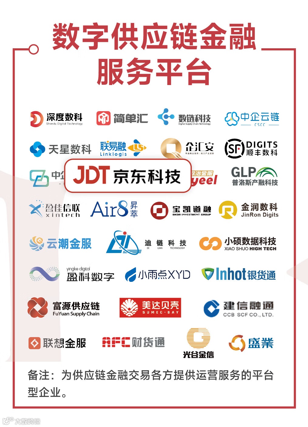 在生态图谱的定义中,数字供应链金融服务平台是指“为供应链金融交易各方提供运营服务的平台型企业”,也就是说,这些入围者本身就搭建了供应链金融服务平台,链接资金与资产,核心是推广和运营能力。在这个生态位中,包含京东科技、深度数科、简单汇、数链科技、中企云链、联易融等为代表的数十家企业。