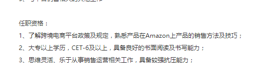 当初他在投简历的时候,经常看到跨境电商相关职位的任职要求里写着英语要达到4级或6级。如果会小语种就更加完美了。