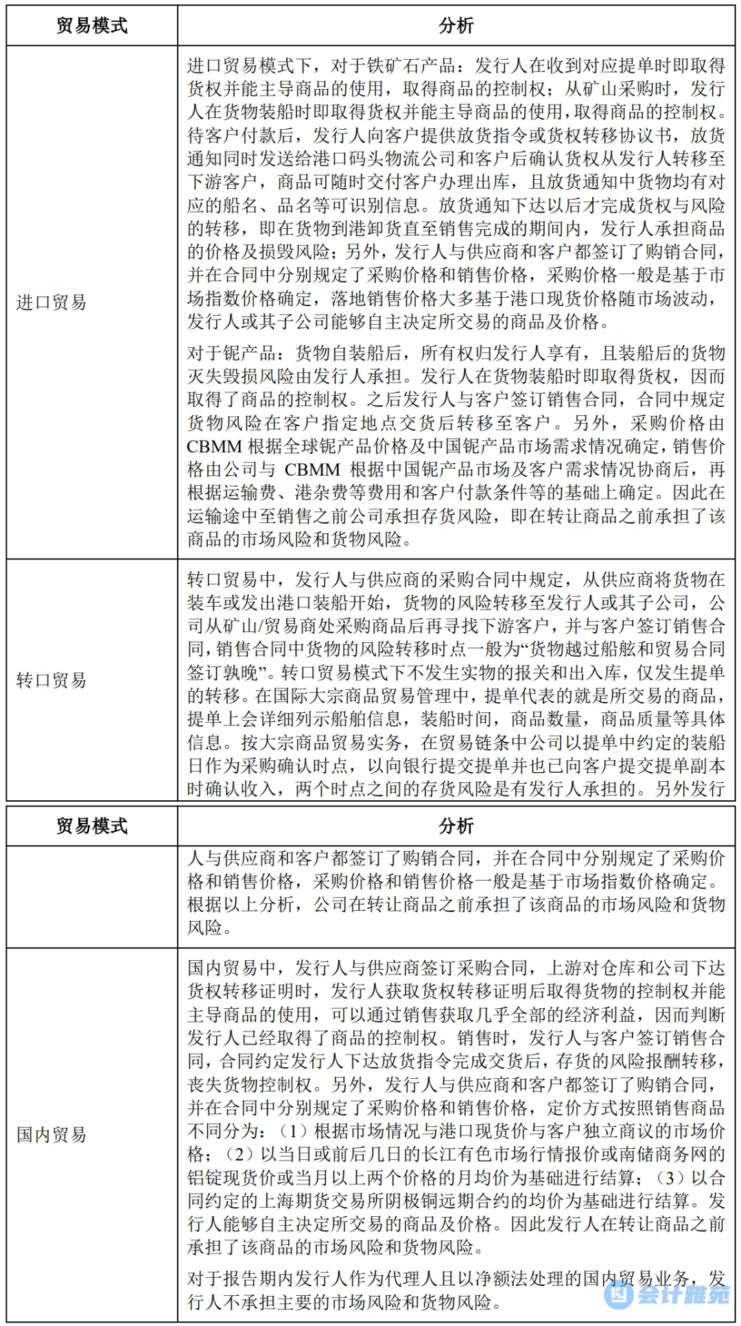 经查阅发行人报告期内与主要客户的销售合同, 报告期内,发行人不同贸易模式下的市场风险和货物风险情况如下: