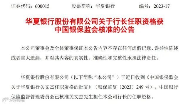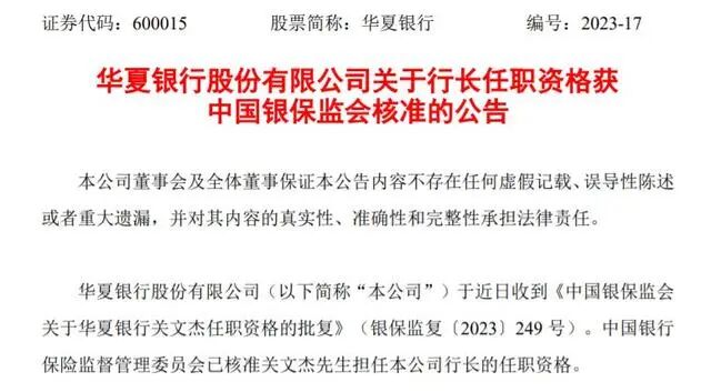 4月24日,华夏银行发布公告,该行近日收到《中国银保监会关于华夏银行关文杰任职资格的批复》(银保监复〔2023〕249 号),关文杰担任行长的任职资格获核准。