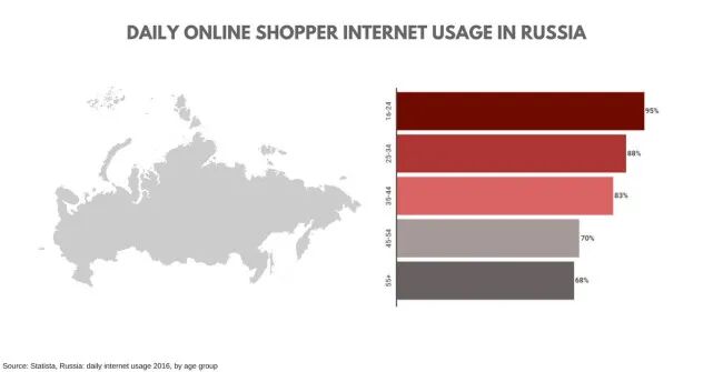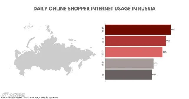 将俄罗斯的互联网用户按照不同年龄组分类,我们可以更好地了解俄罗斯电子商务市场。在俄罗斯,16-24岁年龄段中有95%的人每天都会登陆互联网,25-34岁和35-44岁年龄段分别有88%和83%的人每天登录。值得注意的是,俄罗斯的老一代人也会定期登录互联网,45-54岁年龄段和55岁以上年龄段人每日登陆互联网的渗透率分别为70%和68%。