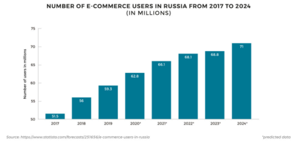 俄罗斯目前有6260万电子商务 用户 ,每年在线花费374.86美元。到2024年,这一数字预计将增加到7100万在线购物者,每人将 花费约434.13美元。