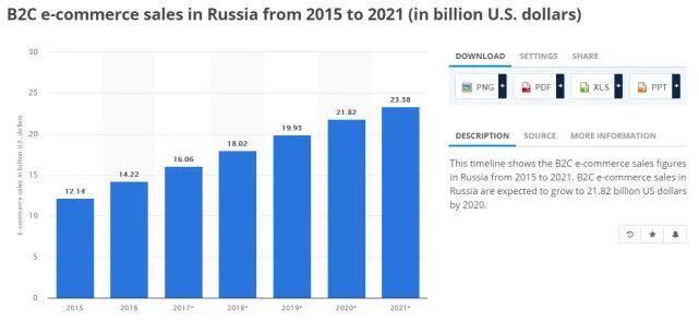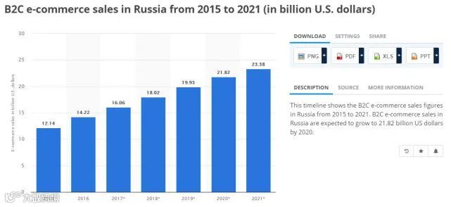 根据 Statista 数据,俄罗斯2018年电子商务市场收入达到180亿美元,预计到2021年的市场交易量将达到至少230亿美元。