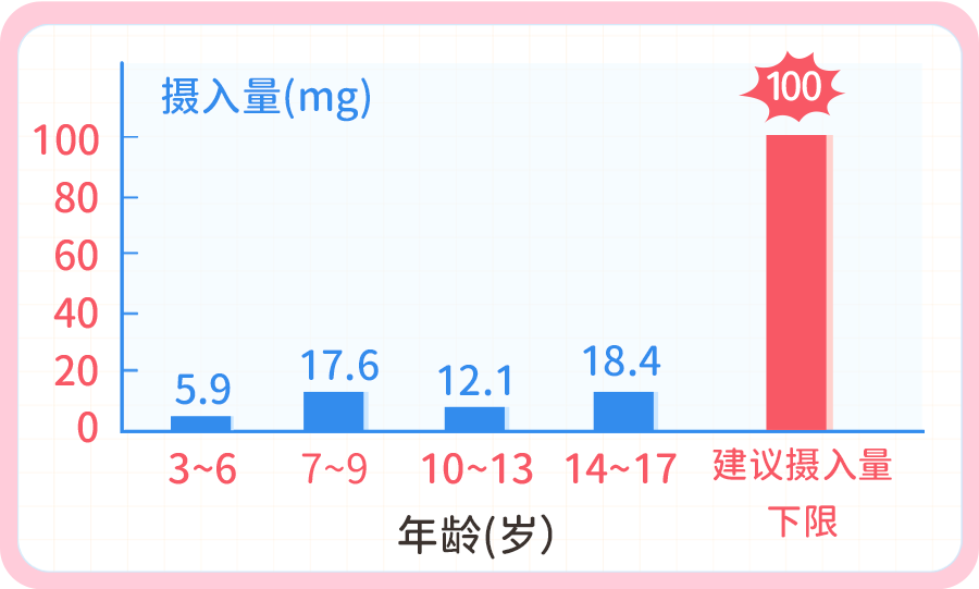 ▲中国 9 省 3~17 岁儿童青少年 DHA 摄入量