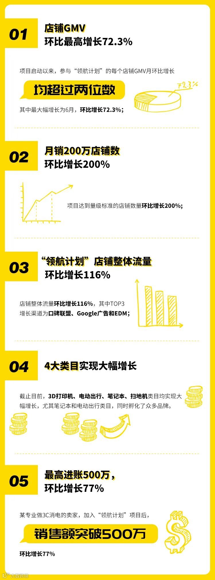 其中,某专业做3C消电的卖家,加入“领航计划”项目后,销售额成功突破500万,环比增长77%!
