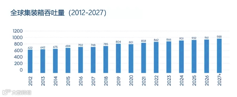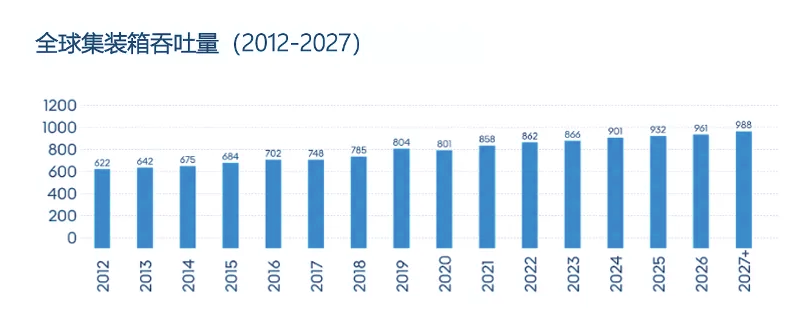 根据过去十年的数据和未来四年的趋势预测,全球集装箱吞吐量稳步增长。2023年全球集装箱吞吐量达到8.66亿标准箱。预计未来四年这个数值将继续增加,并在2027年接近10亿标准箱。