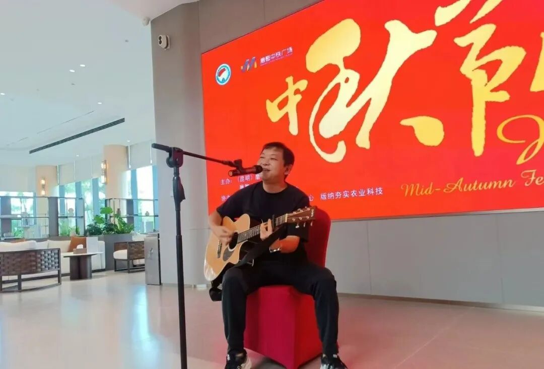 西双版纳志科置业有限公司总经理严宇的吉他弹唱《让我听懂你的语言》带动了全场的气氛。