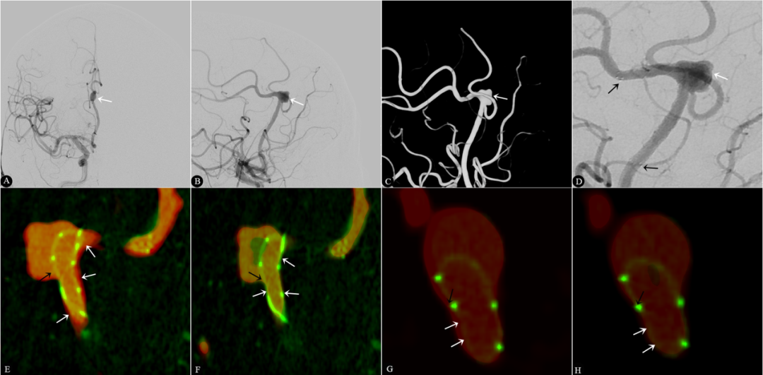 A、B、C.2D-DSA和提示右侧大脑前动脉A2段动脉瘤,大小5.2×6.8mm,瘤颈5mm,头颈比1.36,载瘤动脉远端和近端直径分别为2.1mm和2.9mm(白色箭头示动脉瘤)。D.术后影像学显示动脉瘤即刻对比剂明显滞留(白色箭头示动脉瘤,黑色箭头显示支架的头部和尾部)。E、G.HR-FDCT显示支架完全释放但部分区域贴壁不良(白色箭头示载瘤动脉区域贴壁不良,黑色箭头示瘤颈区域贴壁不良;其中绿色部分为支架及其编制丝,红色部分为载瘤动脉和动脉瘤);F、H.经J形导丝和球囊促进贴壁后HR-FDCT显示支架贴壁良好(白色箭头示载瘤动脉区域现贴壁良好,黑色箭头示瘤颈区域现贴壁)。