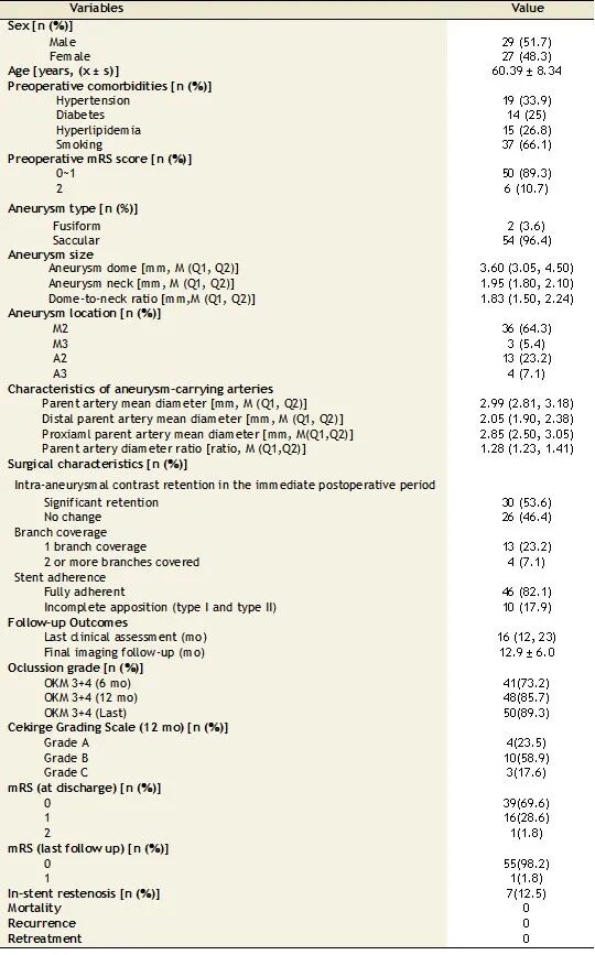使用SPSS 27.0(IBM,Armonk,NY,USA)软件进行统计分析。定量变量数据以均值±标准差,并使用Student's t-test在组间进行比较。分类变量以频数(百分比)表示,并组间比采用χ2检验或Fisher精确检验。由两位高年资神经介入医师分别对OKM分级、支架贴壁情况以及Cekirge分级进行独立评估,采用Cohen's Kappa系数评估观察者间一致性,计算κ值及其95%置信区间(CI)。通过单因素分析筛选动脉瘤完全闭塞的预测因素,将P值<0.05的因素纳入多因素logistic回归分析,以供进一步分析。所有统计学检验均采用双侧检验,P值<0.05被认为具有统计学意义。