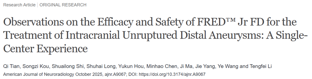 背景:目前,FRED™ Jr的应用适应证正逐步拓展。然而,对于部分位于颅内远端的未破裂动脉瘤,如大脑中动脉M2/M3段及大脑前动脉A2/A3段及更远端的病变,其治疗的安全性与有效性仍缺乏充分证据。本研究旨在评估FRED™ Jr在此类未破裂远端动脉瘤治疗中的安全性和有效性,重点分析FD覆盖穿支血管的远期预后,并探讨远端动脉瘤延迟闭塞的独立危险因素。