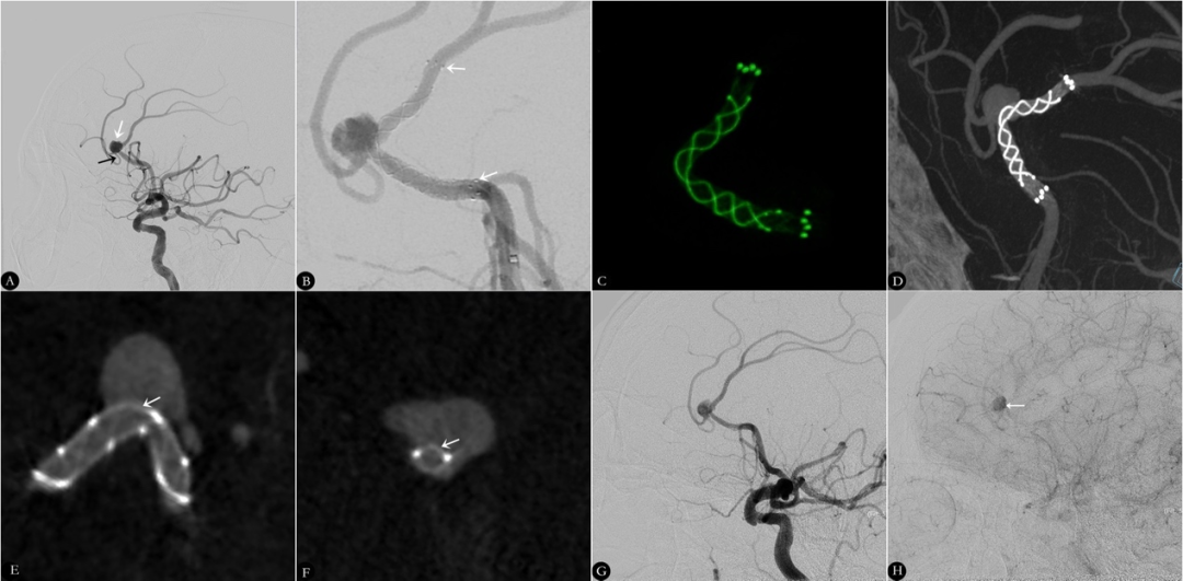 A.2D-DSA和提示左侧大脑前动脉A2段动脉瘤,大小5.3×7.1mm,瘤颈4.7mm,头颈比1.51,载瘤动脉远端和近端直径分别为2.6mm和3.2mm(白色粗箭头示动脉瘤,黑色细箭头示动脉瘤穿支动脉)。B.术后影像学显示动脉瘤即刻对比剂明显滞留(白色箭头显示支架的头部和尾部)。C、D.HR-FDCT显示支架完全释放并完全贴壁;E、F.动脉瘤颈处HR-DCT成像显示支架完全贴壁(白色箭头示瘤颈处支架编织丝)。G、H.6个月DSA下复查载瘤动脉通畅,动脉瘤延迟闭塞,但可见静脉期动脉瘤内造影剂滞留。