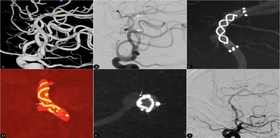 A.3D-DSA提示左侧大脑前动脉A2段动脉瘤,大小2.4×2.7mm,瘤颈2.1mm,头颈比1.10,载瘤动脉远端和近端直径分别为2.7mm和3.1mm。B.术后影像学显示动脉瘤即刻对比剂明显滞留(白色箭头显示支架的头部和尾部)。C.HR-FDCT显示支架完全释放并完全贴壁(白色箭头示瘤颈处支架编织丝);D、E.动脉瘤颈处HR-DCT成像显示支架完全贴壁。F.6个月DSA下复查载瘤动脉通畅,动脉瘤完全闭塞。