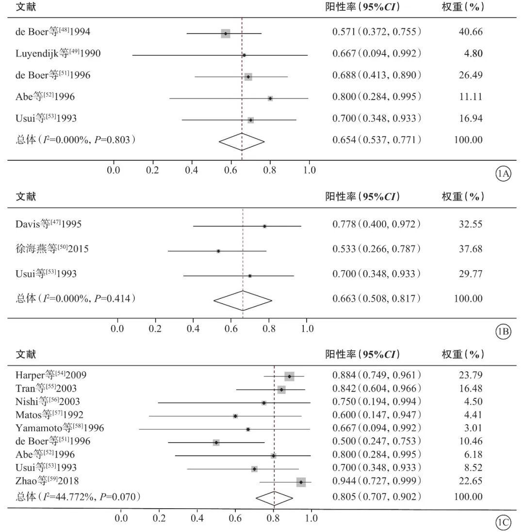四项病例系列研究[52, 54-56](证据等级Ⅳ)及五项病例对照研究[51, 53, 57-59](证据等级Ⅳ)在ARN患者眼内液中采用PCR技术检测疱疹病毒DNA。合并分析显示,PCR检测的总体阳性率为81%(95%CI 71%~90%)(图1C)。